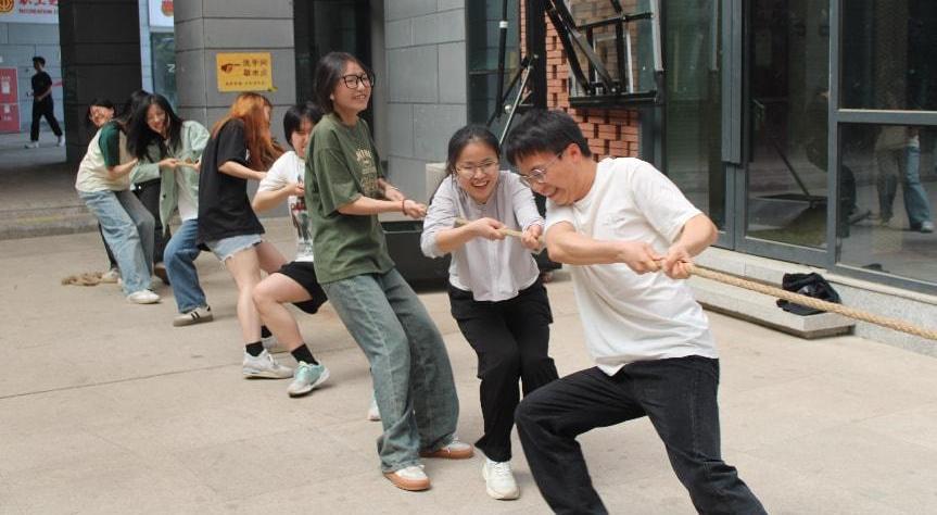 为丰富校园文化生活,增强员工体质,促进各年级员工交流互动,4月14日下午3点至5点,学院在体育馆健美操馆前广场成功举办主题为"快乐不设限,青春正当时"的趣味运动会。本次活动设置了拔河、踢毽子和丑小鸭赛跑三个趣味竞赛项目,吸引了全院各年级员工的积极参与。